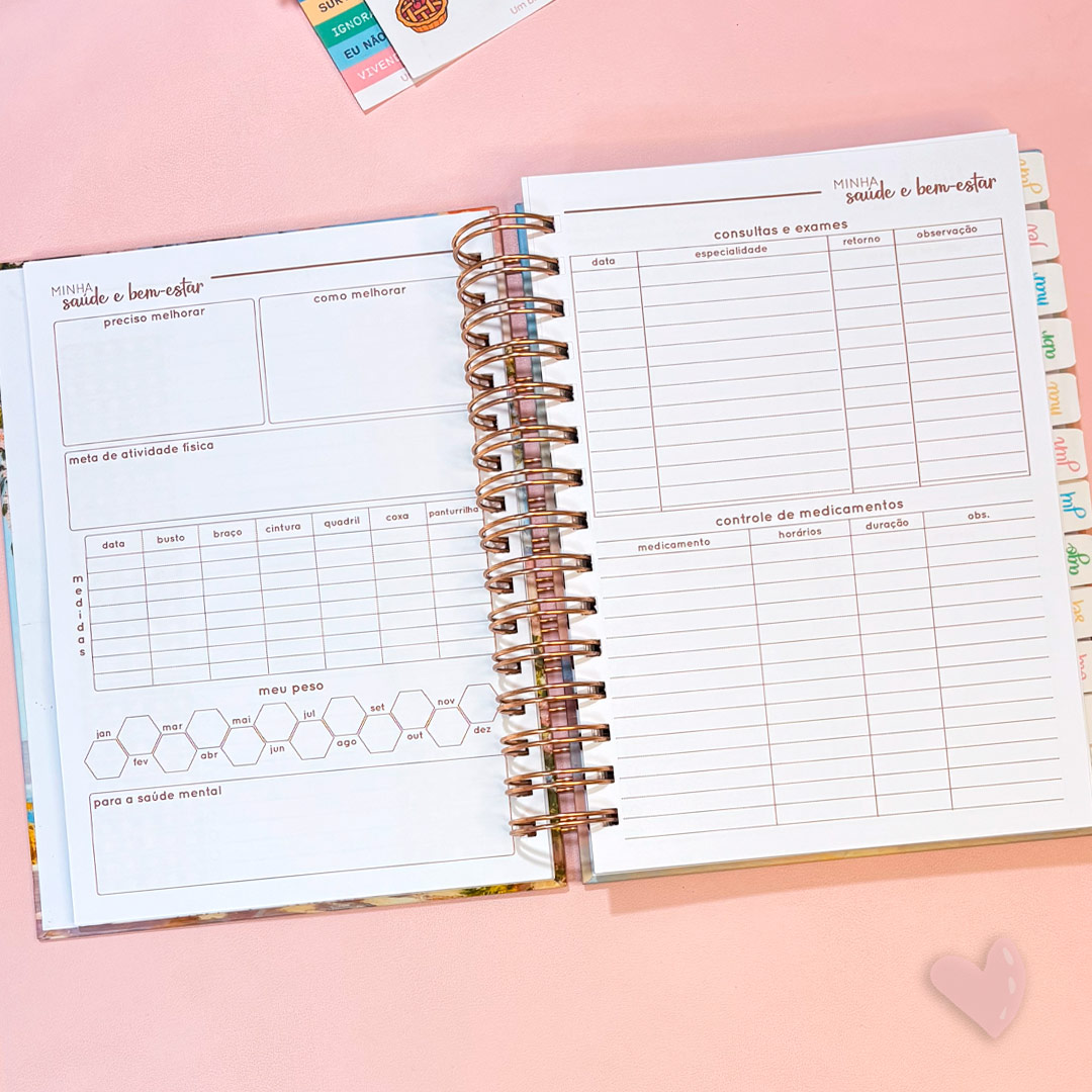 • Minha saúde e bem estar – para registrar quais mudanças são necessárias, acompanhar medidas, peso e ações para a atividade física e saúde mental. Marque suas consultas e exames e registre os medicamentos em uso (2 páginas);