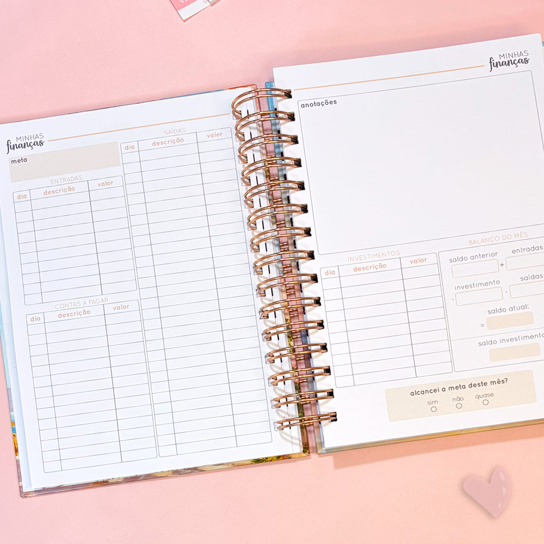 • Controle financeiro – registro de entradas, saídas, contas a pagar, investimentos, anotações, balanço de mês para registro do saldo anterior, total de entradas, valores investidos, total de saídas, saldo atual, saldo de investimentos e controle das metas financeiras;