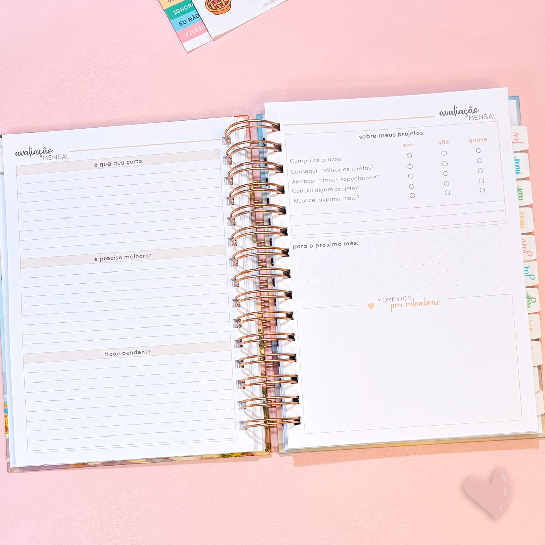 • Avaliação mensal – duas páginas para rever como foi o mês e aprender com o que fizemos, ou não, antes de iniciar um novo mês;