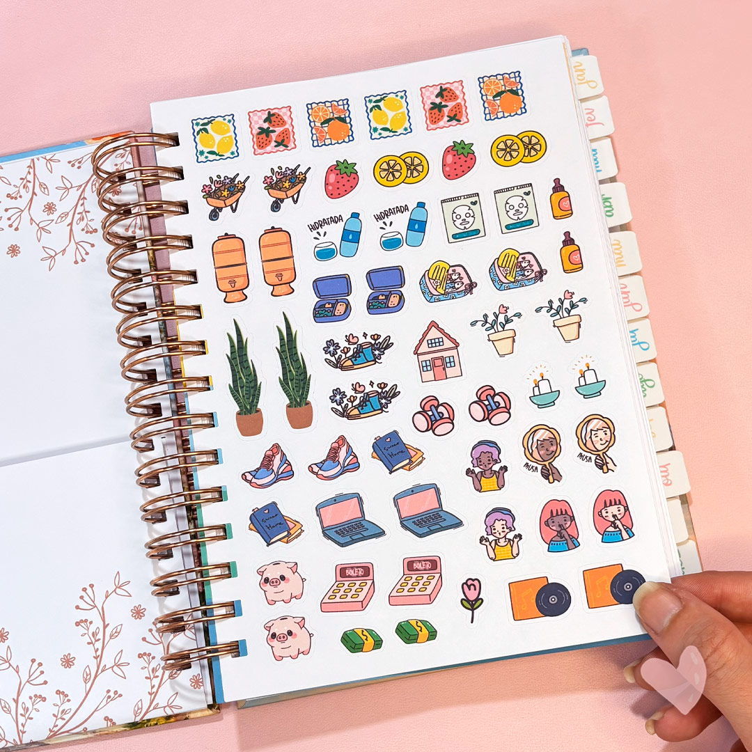 • 2 Cartelas de adesivos: uma com 56 adesivos decorativos (e muito fofos) e outra com 96 adesivos de palavras;