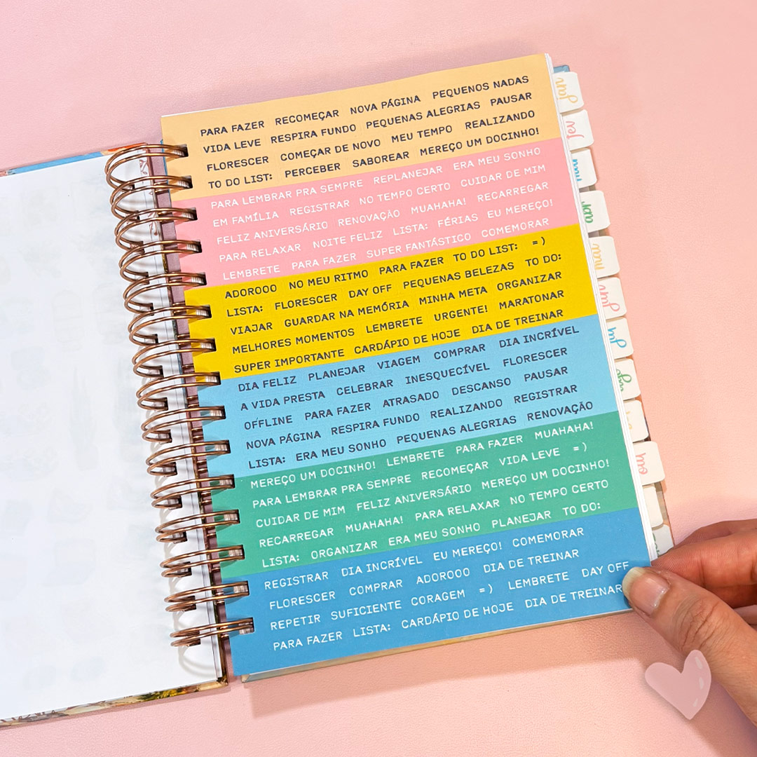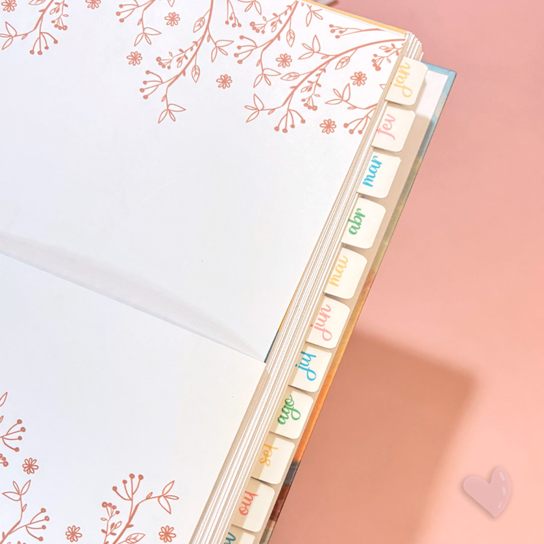 • Divisórias do mês com abas adesivas e coloridas, com o mês vigente e uma frase para inspiração;