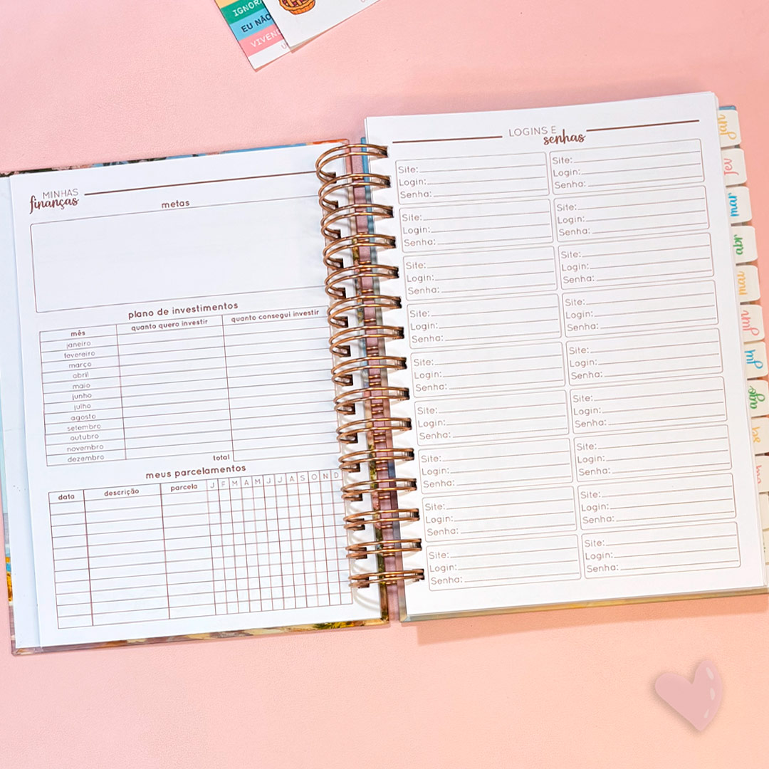 • Logins e senhas – aqui você registra essas “senhoras” que teimam em fugir da nossa cabeça. E claro, não precisa ser literal, podem ser apenas lembretes (1 página);