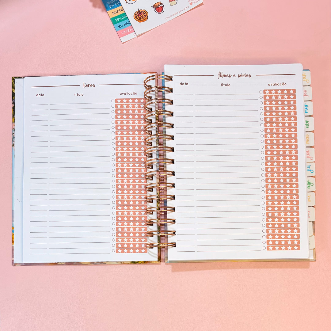 • Lista de livros, filmes e séries. Sempre é bom dedicar tempo para o lazer e com essas listas, é possível saber se você está se dando esse tempo merecido (2 páginas);